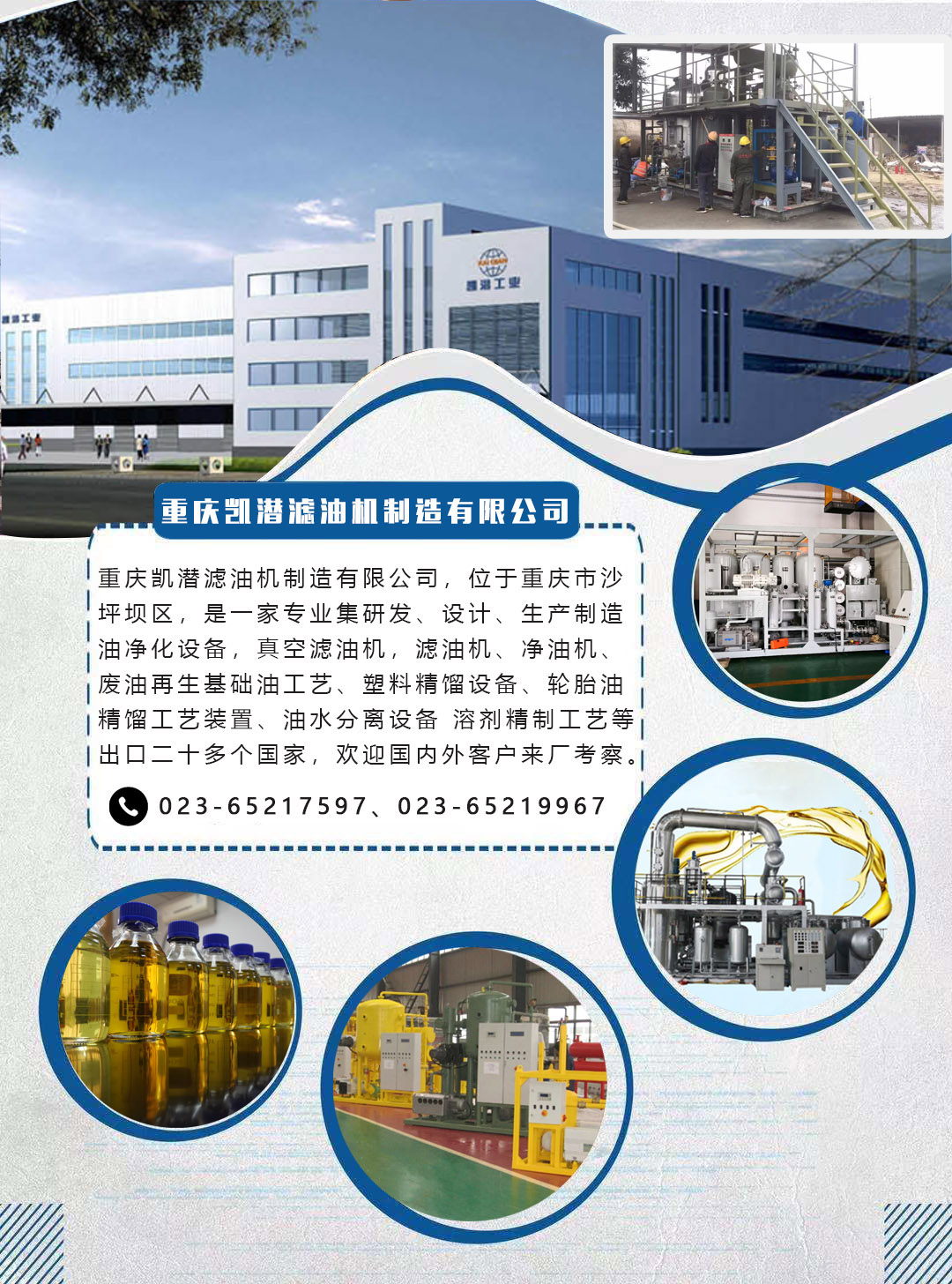 重慶凱潛濾油機(jī)制造有限公司,位于重慶市沙坪壩區(qū),是一家專業(yè)集研發(fā)、設(shè)計、生產(chǎn)制造:廢機(jī)油蒸餾基礎(chǔ)油、基礎(chǔ)油溶劑萃取設(shè)備、廢油減壓蒸餾基礎(chǔ)油成套裝置設(shè)備、廢機(jī)油蒸餾基礎(chǔ)油、基礎(chǔ)油溶劑萃取設(shè)備、廢油減壓蒸餾基礎(chǔ)油成套裝置設(shè)備、廢油提煉汽柴油裝置、塑料柴油精制、輪胎柴油精制、濾油機(jī)、真空濾油機(jī)、變壓器油濾油機(jī)、出口濾油機(jī)設(shè)備為一體的企業(yè)。