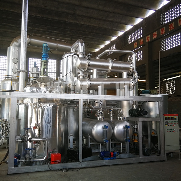 3.1 采用高真空刮膜蒸發器,分離程度高,遠高于傳統蒸餾器。普通的蒸發器在300℃的時候就開始碳化結焦,導致回收的油品質量明顯下降,且回收率也明顯降低。因廢機油里的膠質,瀝青,游離碳等雜質非常多,所以采用高真空刮膜蒸發器可有效的防止這些物質結焦,有效保障設備長期運行的同時還能提高廢油產量。