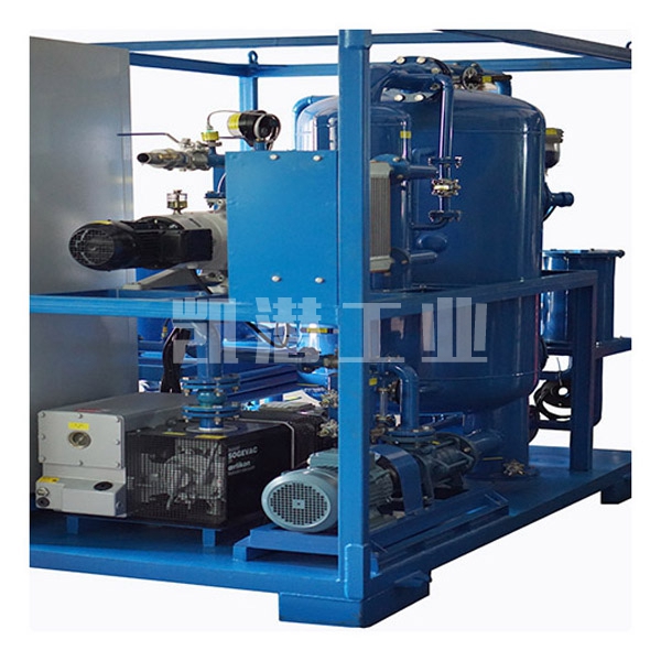 待處理的油經(jīng)過一級(jí)粗濾器后進(jìn)入加熱器進(jìn)行加熱,加熱后的油經(jīng)過第二級(jí)過濾器到螺旋噴淋霧化系統(tǒng),變?yōu)榇至lF狀下落到反應(yīng)塔上進(jìn)入真空分離室,水分即開始蒸發(fā),油霧在罐內(nèi)形成立體的多層面的蒸發(fā)結(jié)構(gòu),通過短時(shí)的循環(huán),便可達(dá)到凈化目的。經(jīng)過除雜質(zhì)、脫水、脫氣、除酸的油品在油泵的作用下經(jīng)過精密過濾器完成一個(gè)凈油工作循環(huán)。從真空分離室中分離出來的水蒸氣熱空氣進(jìn)入冷疑器,大部分水蒸氣凝結(jié)為水存入積水倉,排出機(jī)外,油中熱空氣經(jīng)冷卻后由真空泵排出。